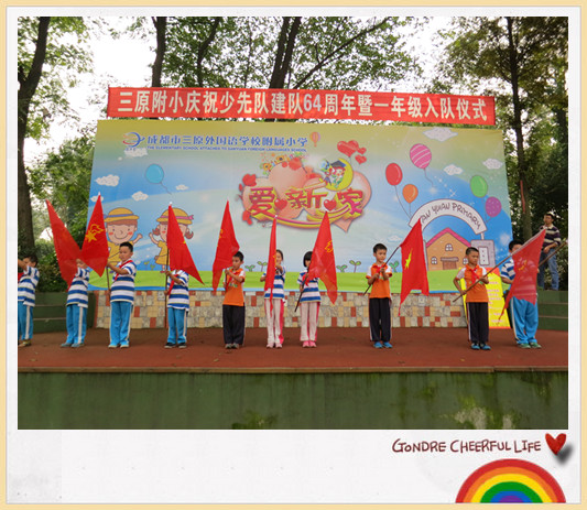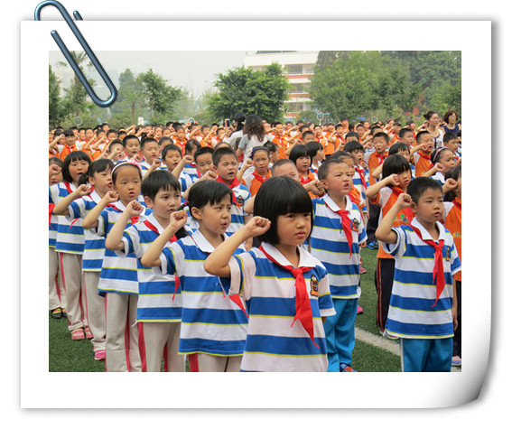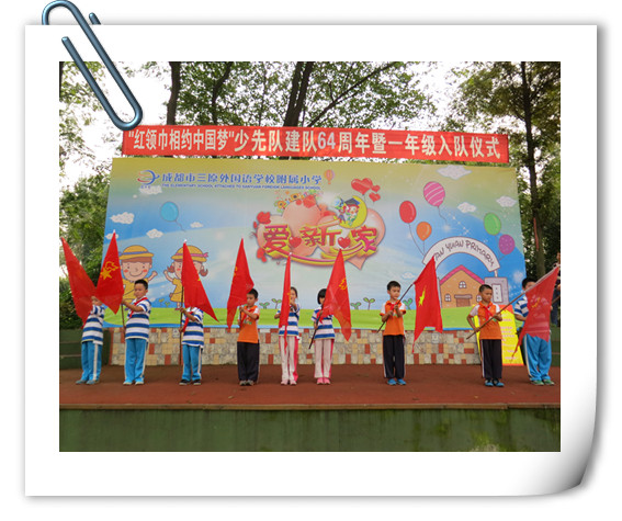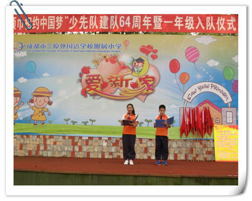 (成都市三原外国语学校附属小学 10月10日报道)金色的十月带给我们太多的喜悦——10月1日,我们欢庆了祖国母亲的64华诞,感受到祖国的伟大与富强;10月13日,我们又即将迎来中国少年先锋队的64周岁生日。为此,我校大队部举行了隆重的“红领巾,相约中国梦!——庆祝建队64周年暨一年级新队员入队仪式”,在活泼的队歌声中,我校400余名新队员光荣入队,并在队旗下庄严宣誓——愿在红领巾的指引下,好好学习、好好工作、好好劳动!时刻准备着,为共产主义事业而奋斗!