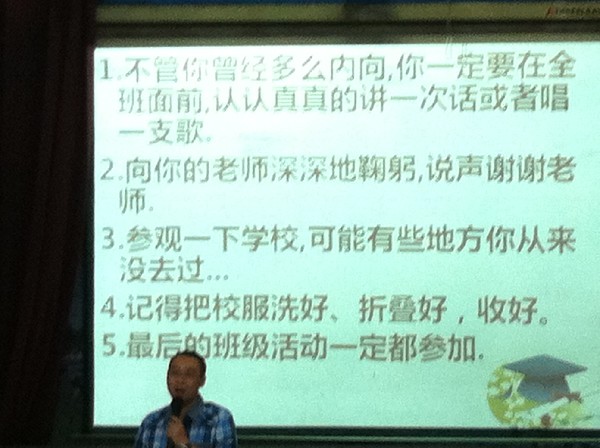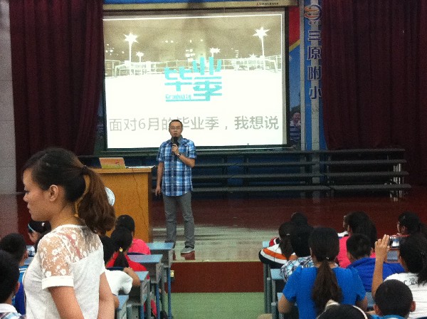 五月十九日下午,六年级全体同学来到阶梯教室,开展主题为“感恩母校,争做优秀毕业生”的年级活动。活动中,大队辅导员江老师做了题为“毕业季”的讲座,江老师为同学们播放了大家毕业前想说的话,让孩子们倾听了父母的心声,告诉了孩子们毕业前必须要做的事,告诫孩子们要有正确的人生观,要有正确的目标,要学会珍惜时间,还做了个游戏——价值观拍卖,孩子们看了时间的账本,最后让孩子们吹响自己的号角,奋勇前进。魏校长也作了重要的讲话,最后年级组长宣布了合格毕业生和优秀毕业生的条件。活动中,孩子们听得很认真,受到了深刻的教育。