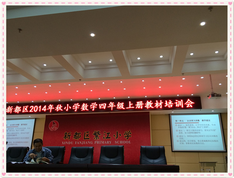 9月23日下午,四年级全体数学教师在新都繁江小学参加了四年级级数学教材分析会,区教研员张永红老师为我们分析了四年级的数学内容,并给了我们很多的教学建议。大家都表示此次分析会受益颇多!