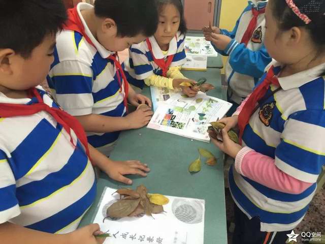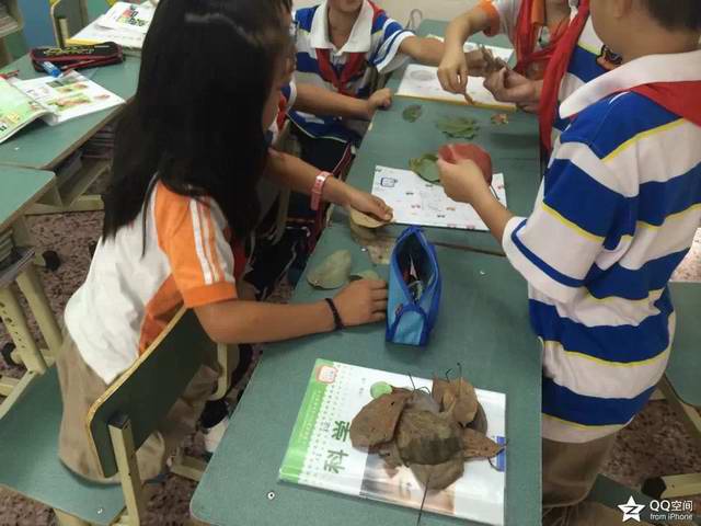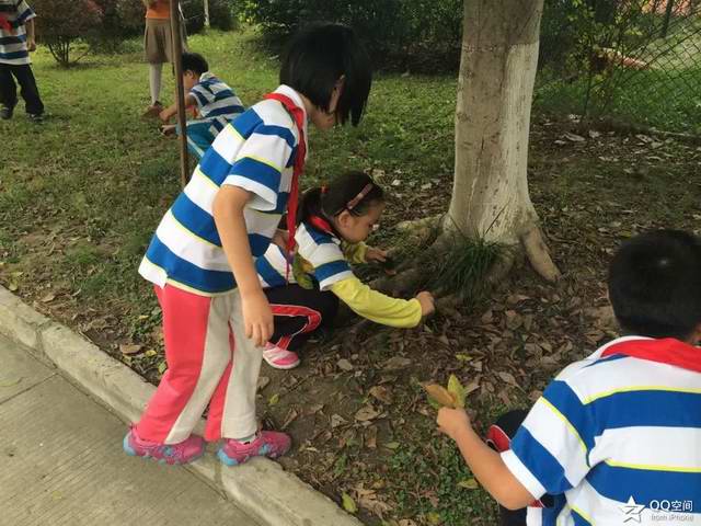 瞧,这个小组正在以叶的形状为标准把他们拾到的落叶进行分类呢。
