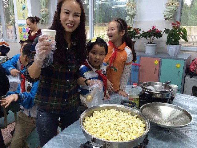 陈李浩宇妈妈向孩子们简单介绍了今天的课堂学习内容:制作爆米花、花生糖及纸杯蛋糕。先将全班同学分成了四个组,每组10人,一个老师负责对一个小组的同学进行演示!讲台上一个老师负责对全班同学讲解。接下来尝试制作爆米花,倒油、下玉米、盖锅盖……一切准备工作就绪后,我们便静静地期待玉米开花的声音。教室里静得出奇。嘭!玉米在锅里跳起了欢快的舞蹈,又好像在打架,争着抢着要出来!教室里断断续续地响起了打击乐的和声!一阵阵香味扑鼻而来,馋得我们的口水飞流直下三千尺!加糖,起锅,盛杯……孩子们顾不上洗手,端起纸杯,来了个纸杯瞬间见底!玉米撞击的音乐声,孩子们的欢笑声,杯盘的撞击声,在3.1班教室奏出了一首童年的歌谣,快乐的歌谣!