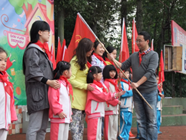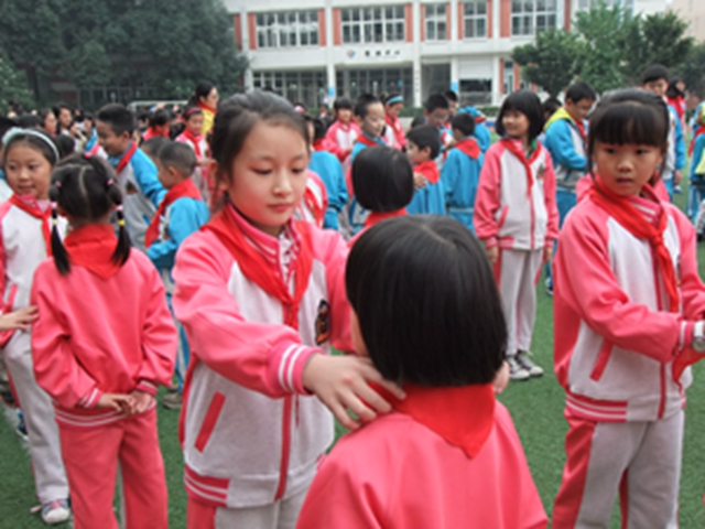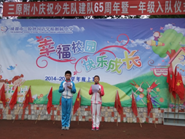 金色的十月带给我们太多的喜悦!10月1日,我们欢庆了祖国母亲的65华诞,感受到祖国的伟大与富强;10月13日,我们又迎来中国少年先锋队的65周岁生日。为此,我校大队部隆重地举行了“红领巾,相约中国梦!——庆祝建队65周年暨一年级新队员入队仪式”,在活泼的队歌声中,我校400余名新队员光荣入队,并在队旗下庄严宣誓——愿在红领巾的指引下,好好学习、好好工作、好好劳动!时刻准备着,为共产主义而奋斗!