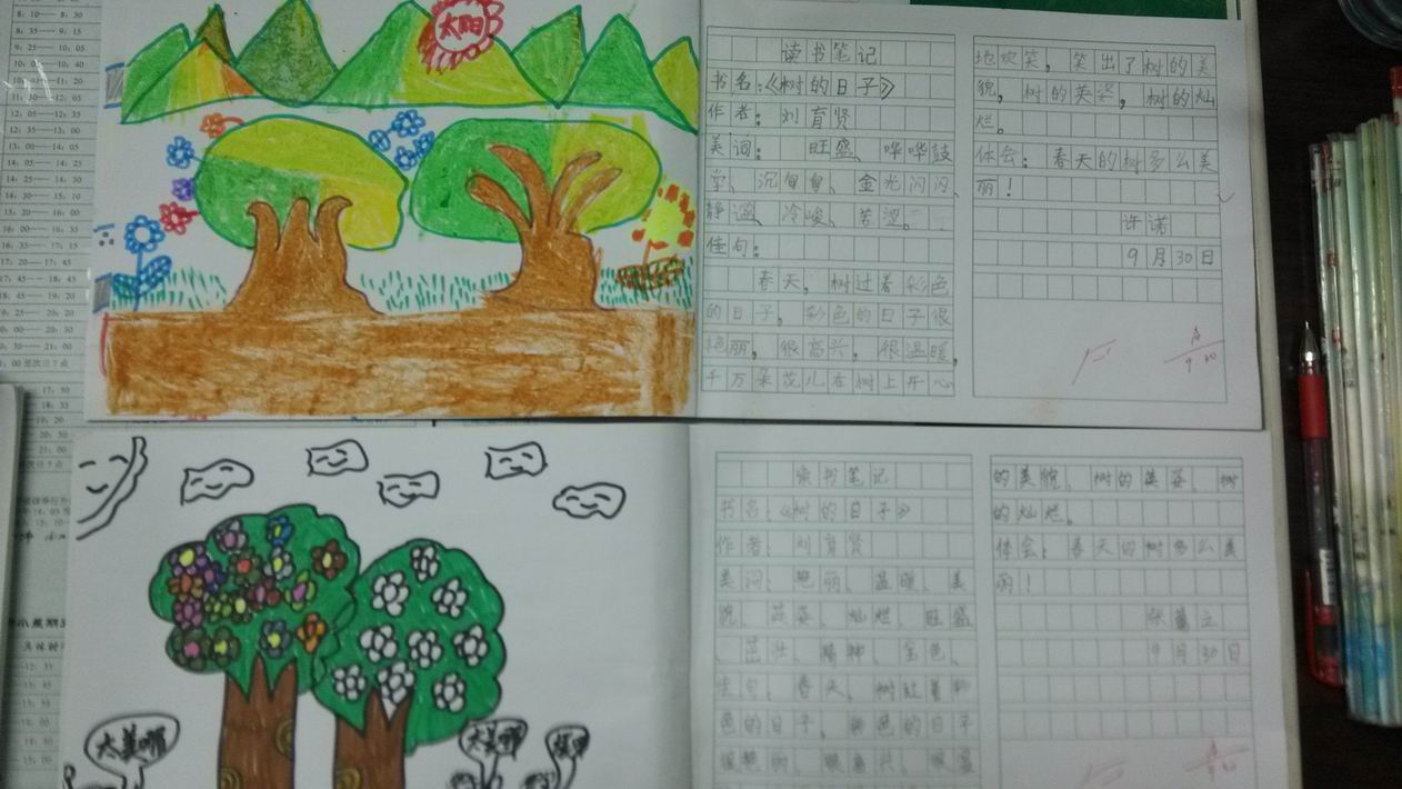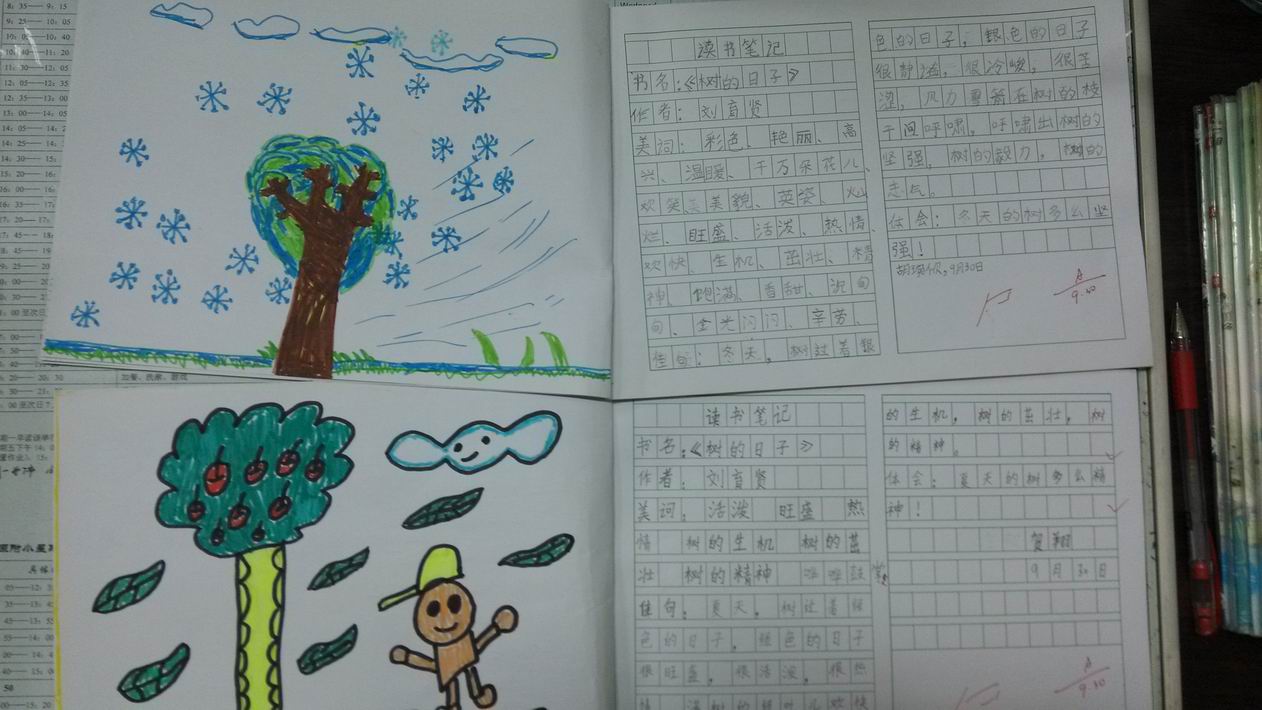 活动从美文的欣赏开始,孩子们跟着音乐轻轻诵读现代散文诗《树的日子》,一遍又一遍感悟树四季的美。在赛读中品析词句,感受语文的魅力。最后一篇篇图文兼美的读书笔记呈现在大家眼前。这既是一次美文赏读之旅,也是一次美丽创造之旅。