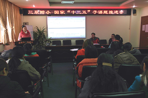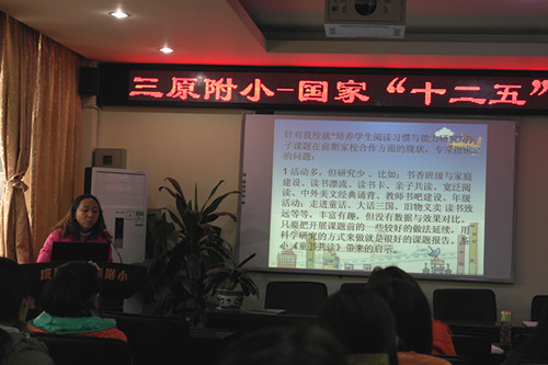 11月26日下午,德育室组织1-5年级班主任召开了国家“十二五”子课题推进会。刘雪莲主任对我校“学校、家庭、社会合作共同培养学生阅读习惯和能力研究”的子课题方案做了回顾,同时对参研人员进行了分工部署。陈虹来主任分享了北京之行的学习成果,就课题研究容易出现的通病和如何采用科学研究方法提供了较好的建议。最后,罗校长鼓励全体语文教师在科研的道路上尽情施展才华,埋头苦干,获得自身教育生活的幸福感。