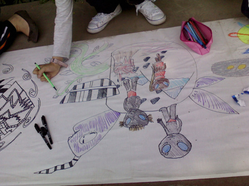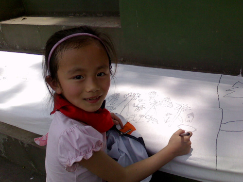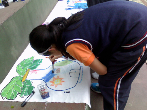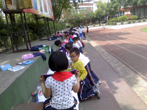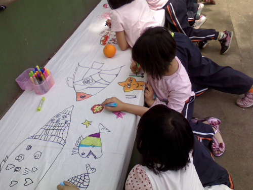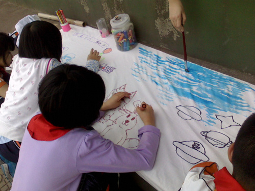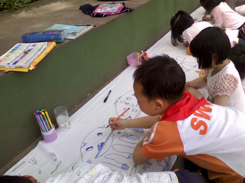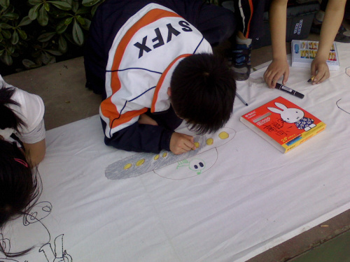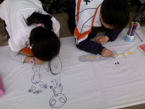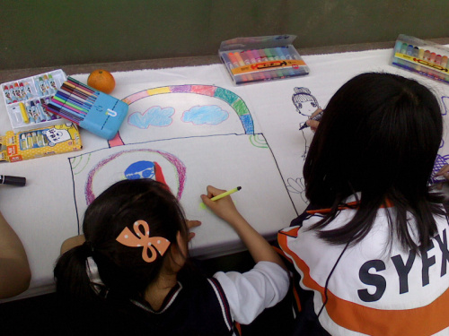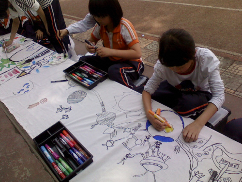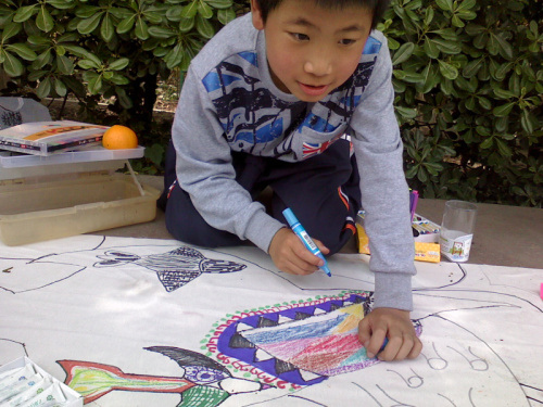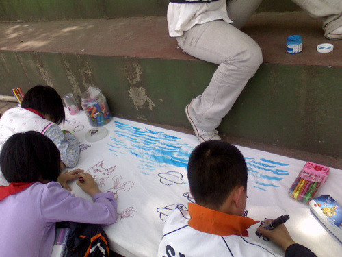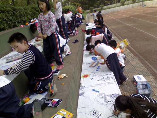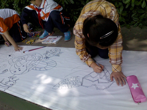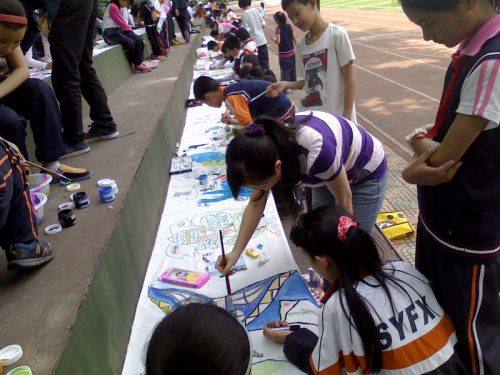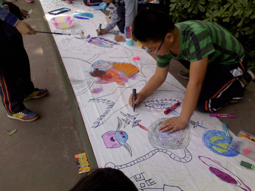 昨天中午,孩子们在美术组老师的组织下,捧着水彩笔,拿着油画棒,来到足球场,准备绘画。孩子们在画布上信心满满地绘上各种各样的图案,线条大方,色彩大胆,充分展示了我校孩子的想象能力和创新能力。