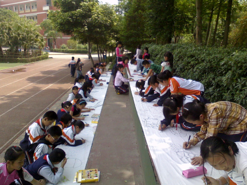 昨天中午,阳光灿烂,我校1——6年级共选出了125名代表参加百米长卷的绘画活动。孩子们用五彩的画笔,在画布上画出自己的世界:一年级是斑斓多姿的海底世界、二年级是生机勃勃的童话森林、三年级是童趣盎然的漫画精灵、四年级是神秘莫测的太空世界、五六年级则是光怪陆离的城市怪楼。