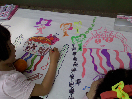 孩子们也非常乐意参加这样的活动,一年级五班的郑子逸小朋友说,他清晨醒来告诉妈妈的第一句话就是:“我好兴奋,因为中午我们就可以在学校画百米画卷了,我要画一个最奇特的水母!”