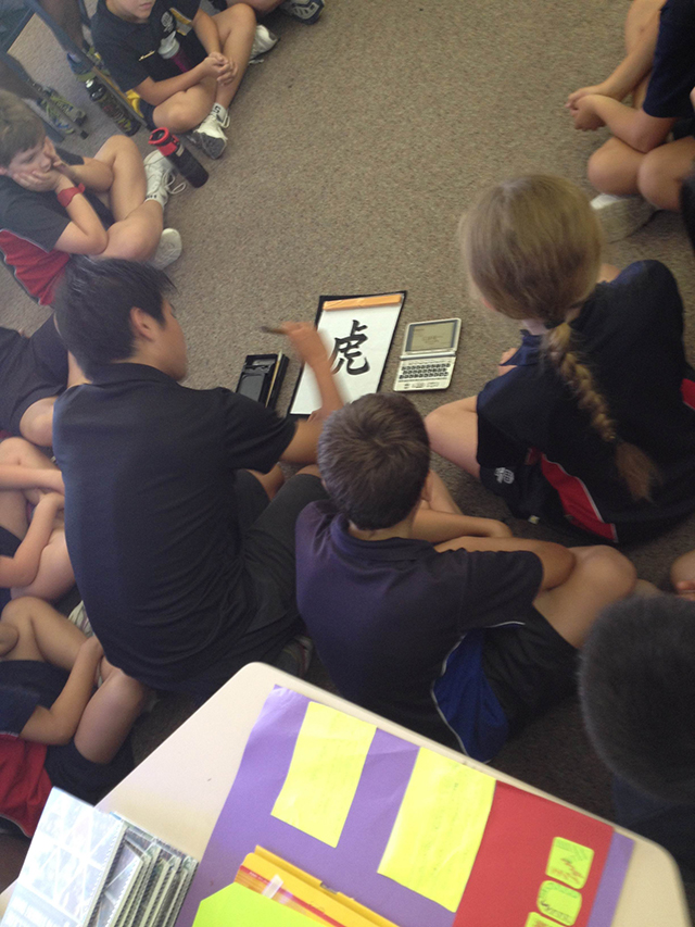 还有日语课也是动静结合,来自日本的Yaku Si Ji老师先让孩子们一起复习了日语单词,比如月份、数字、日期,然后让从东京大学来的日本学生给孩子们讲了许多东京有趣的事儿,尤其是日本鼓,节奏明快,不少孩子都跟着打起了节拍。最有意思的是居然在日语课上有软笔书法练习。孩子们也开始学习如何使用毛笔。