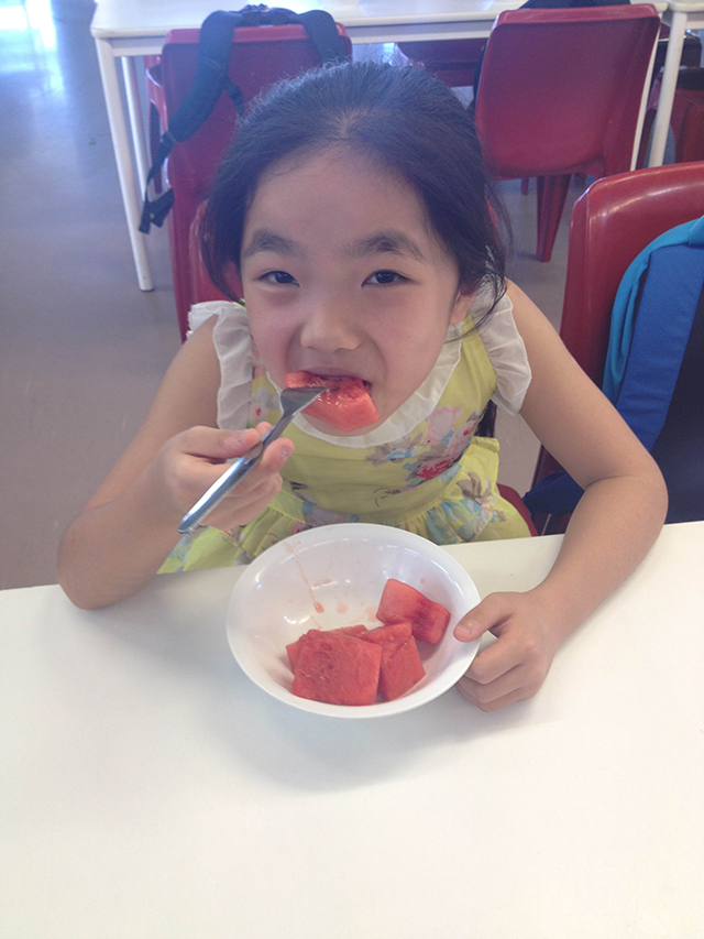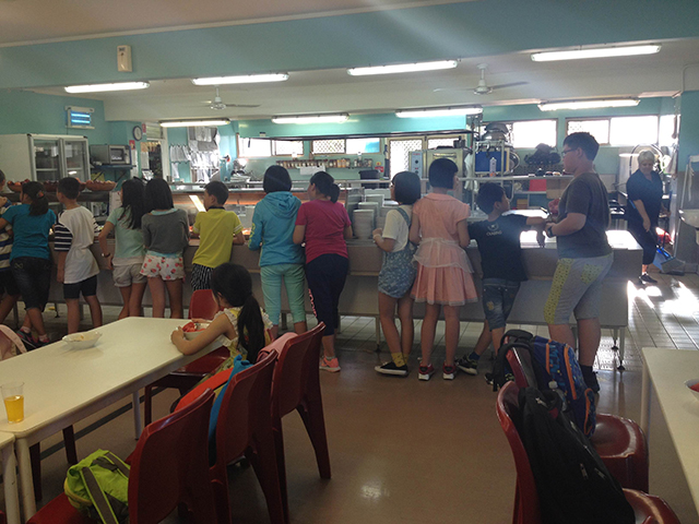 早餐很是丰富,孩子们的碗里都是澳洲本地新鲜运输过来的牛奶与各种粗粮麦片的组合,盘子里是培根、面包,或各种点心。餐厅的阿姨们都会细心准备好各种水果,去皮、切块,并保证新鲜。各种蔬菜,水果的沙拉也是每天无限量供应。只见点心柜台、水果盘、果汁机旁纷纷排起了整齐的队伍,孩子们有序地取自己需要的食物。